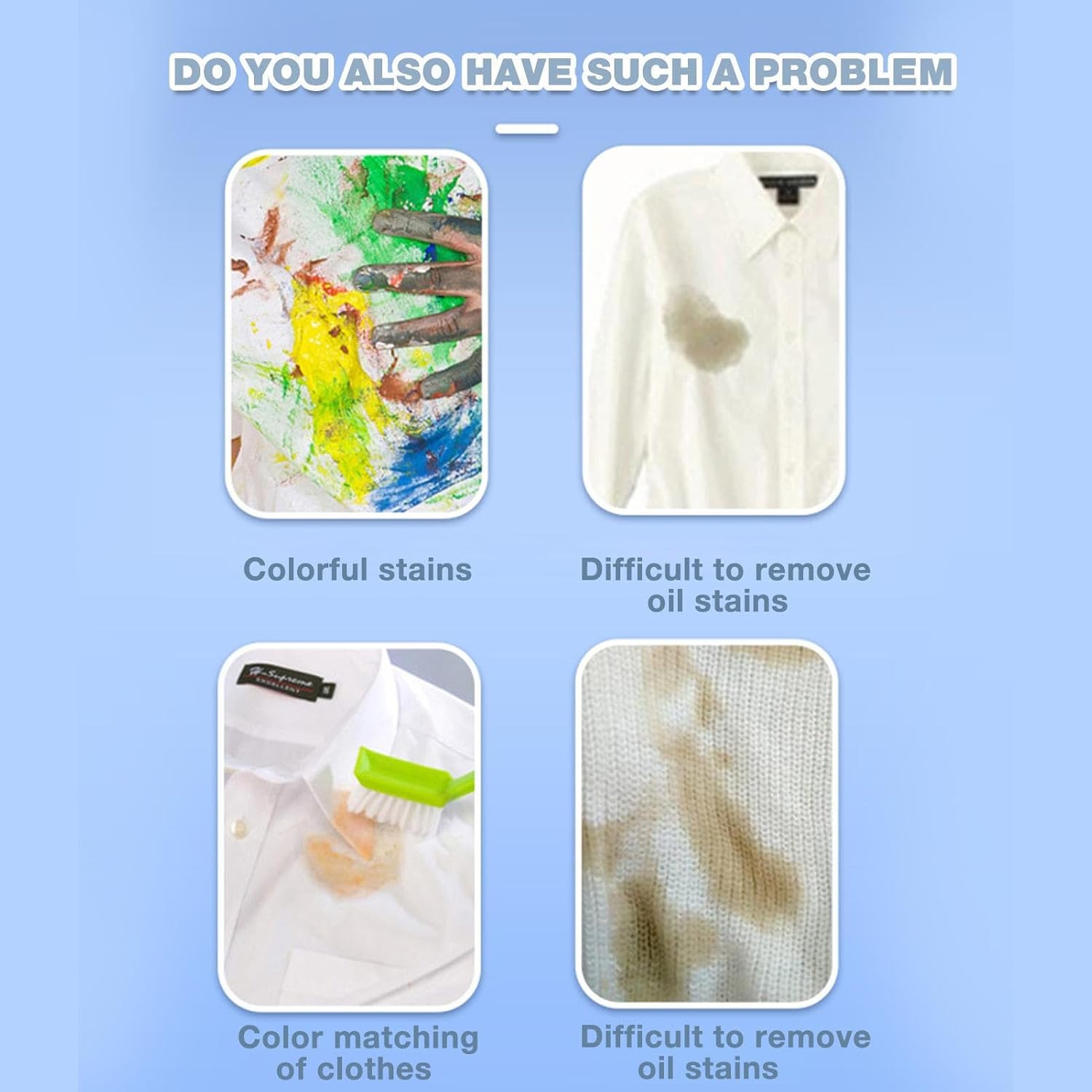 Colorful stains, stubborn oil marks, and color-transfer issues that are hard to remove with regular washing.