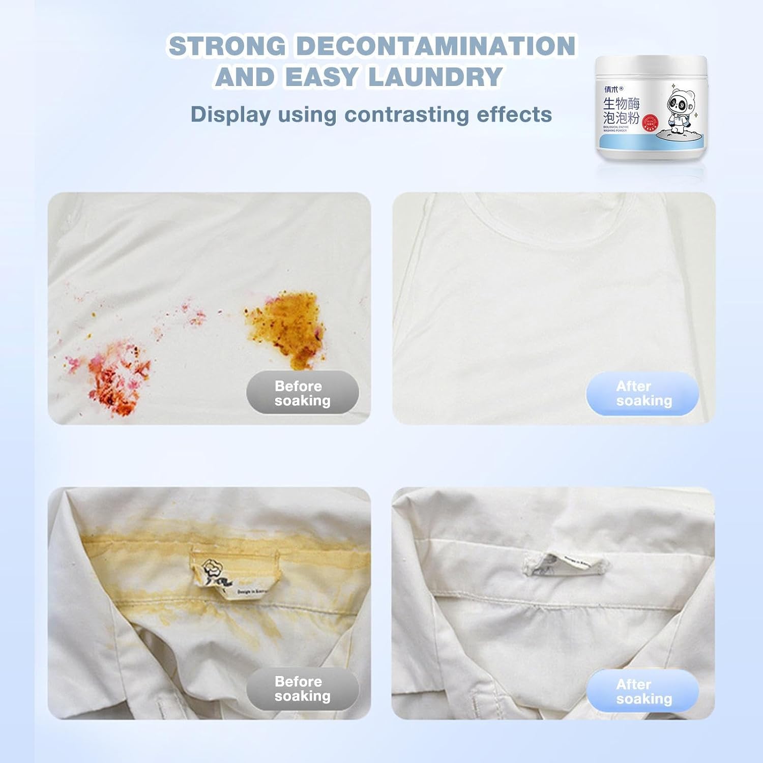 It effectively removes oil, sweat, food, milk, yellowing, and other stubborn stains, including long-set odors.